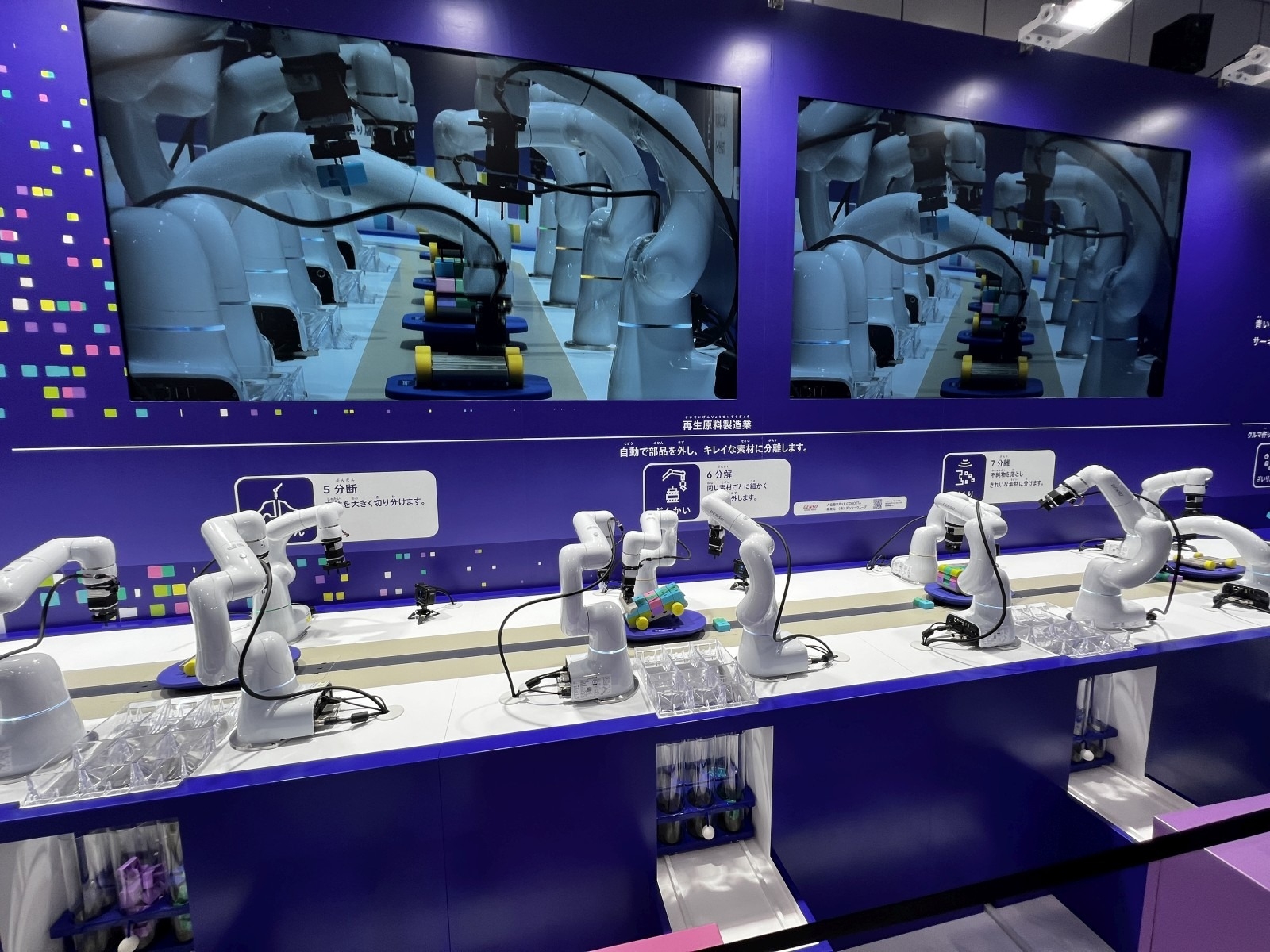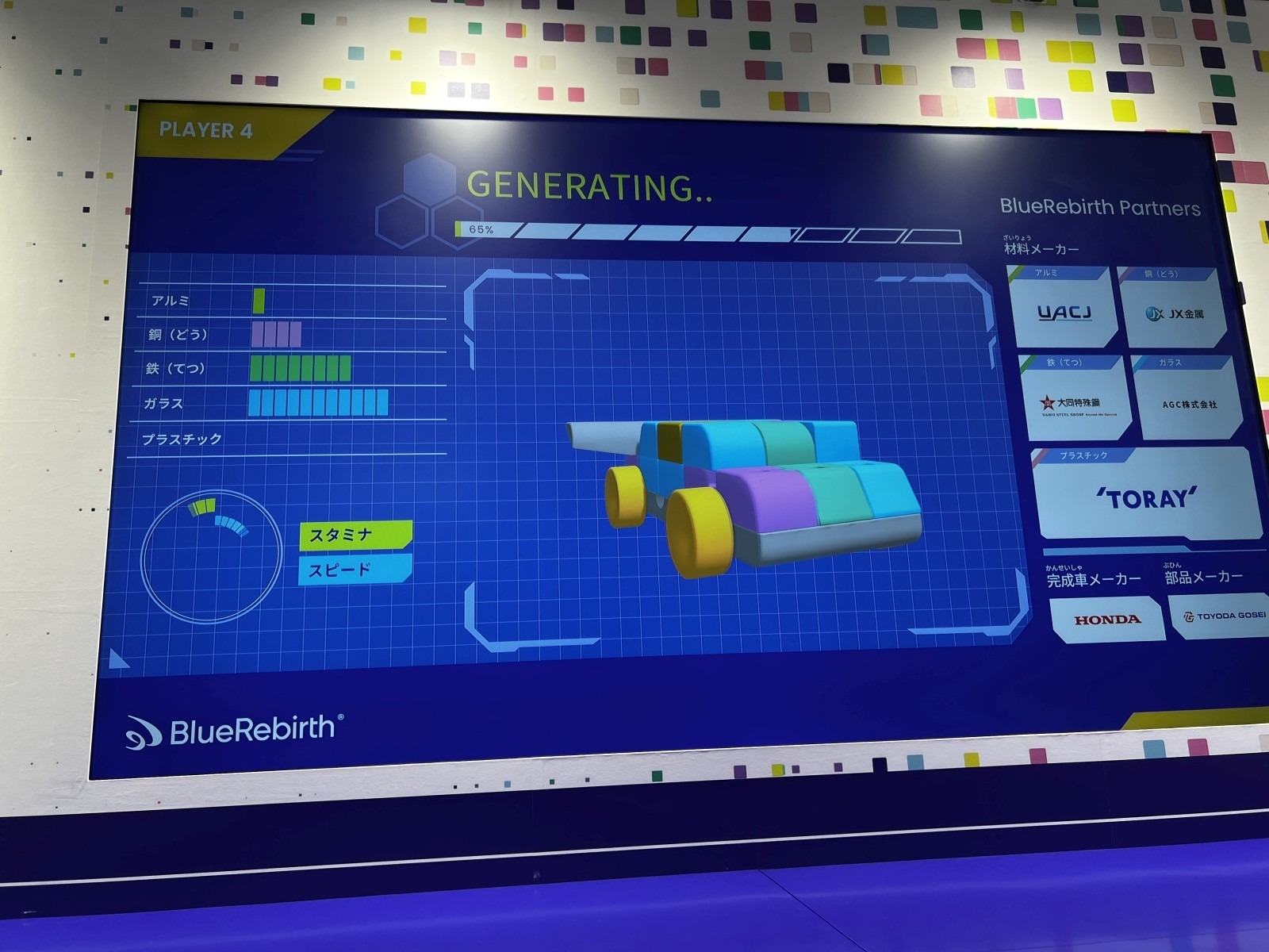 組み立てたクルマは使用した素材(アルミ、銅、鉄、ガラス、プラスチック)によって性能が異なり、ゲーム画面の中を走行したクルマは、最後はロボットによって素材ごとに自動で解体されるのを見ることができます。